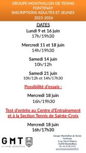 dates inscriptions 2026 regroupé Groupe Montivillon de Tennis - Fontenay > COURS ET STAGE DE TENNIS > INSCRIPTIONS ADULTES / JEUNES SAISON 2025/2026 > dates inscriptions 2026 regroupé